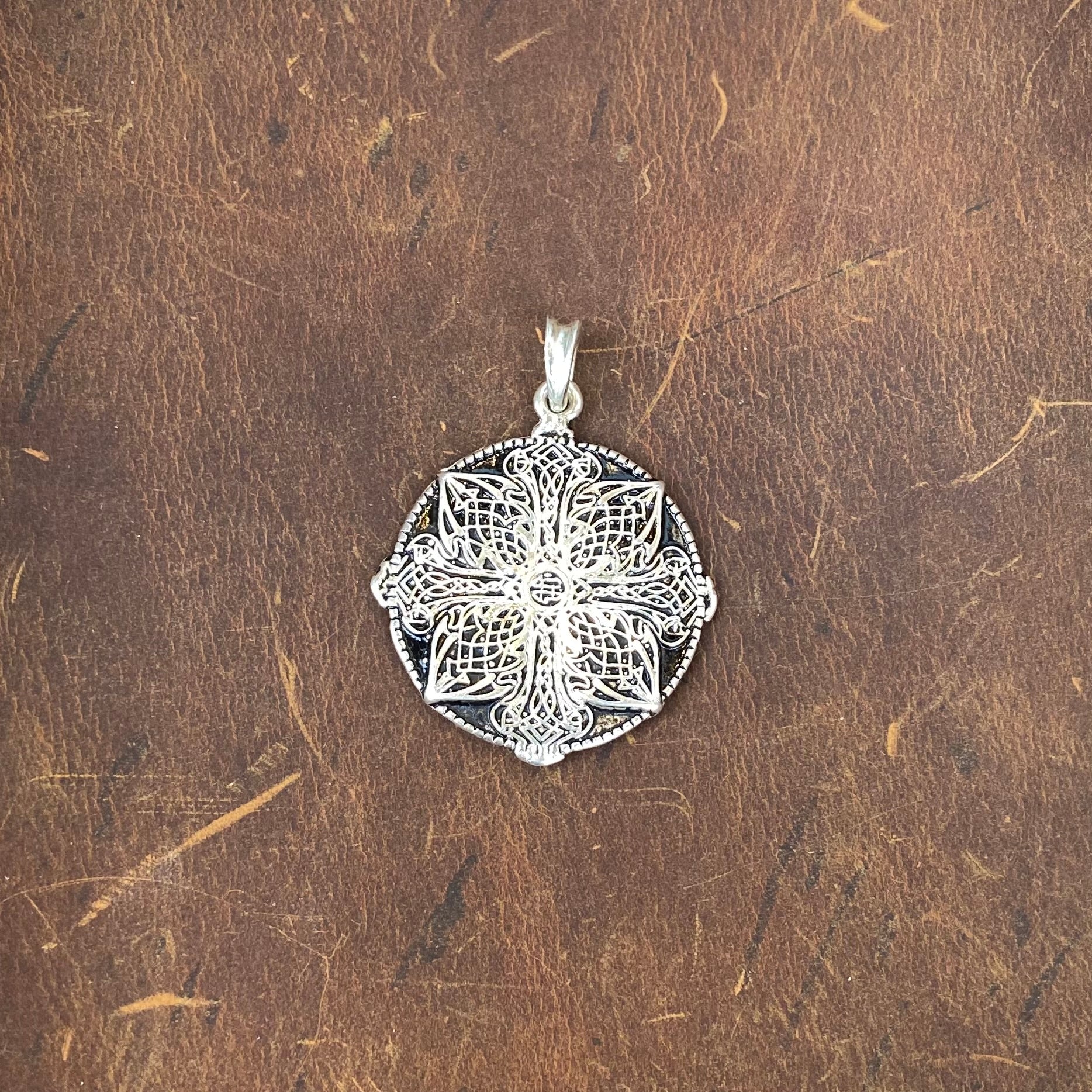 Imposanter Anhänger in keltischem Muster. In versilbert und vergoldet. Durchmesser: 43mm