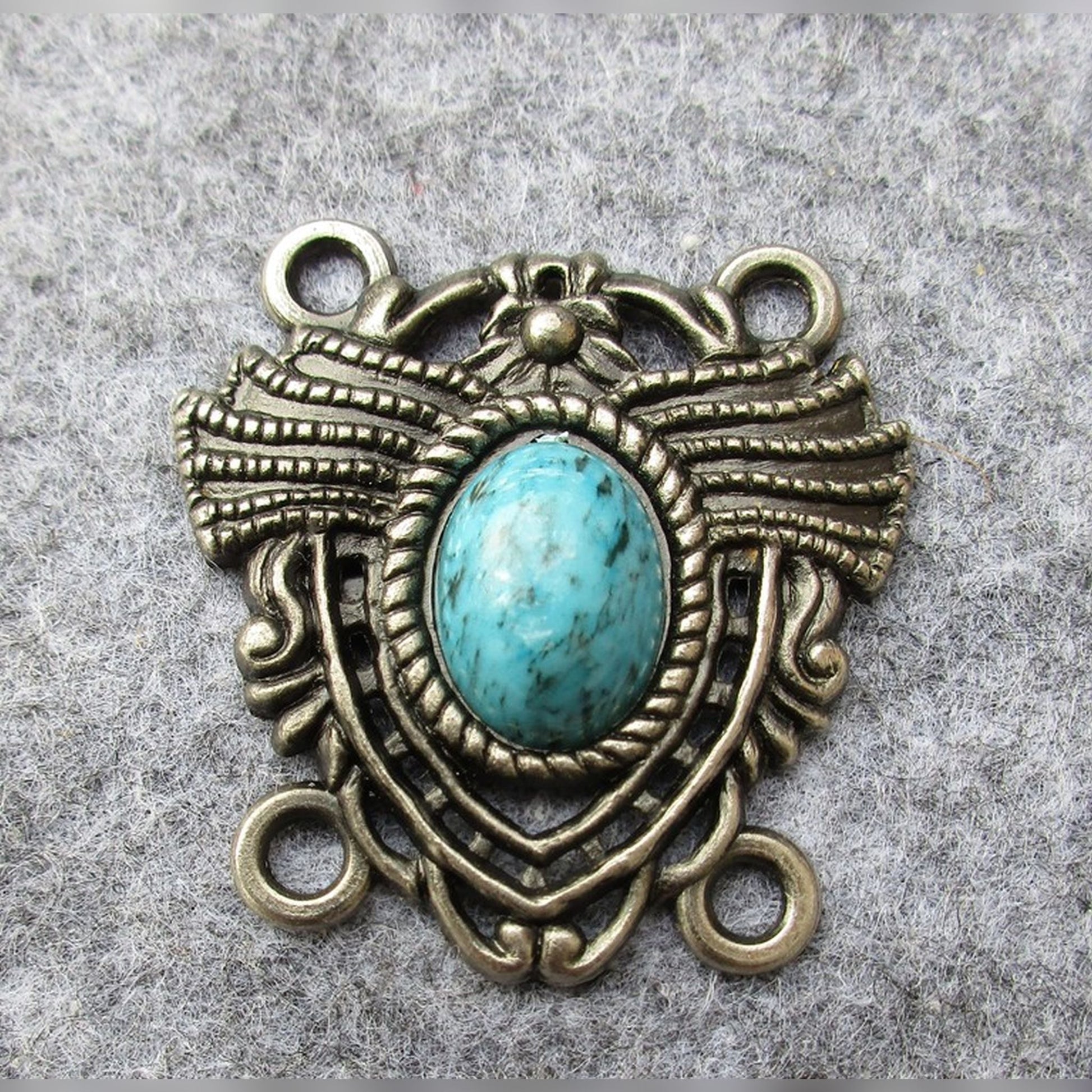 Dekoratives Zierteil in altsilber mit türkisfarbigem Stein. Man kann es annähen oder als Kettenzierteil verwenden. Masse:45x43mm.