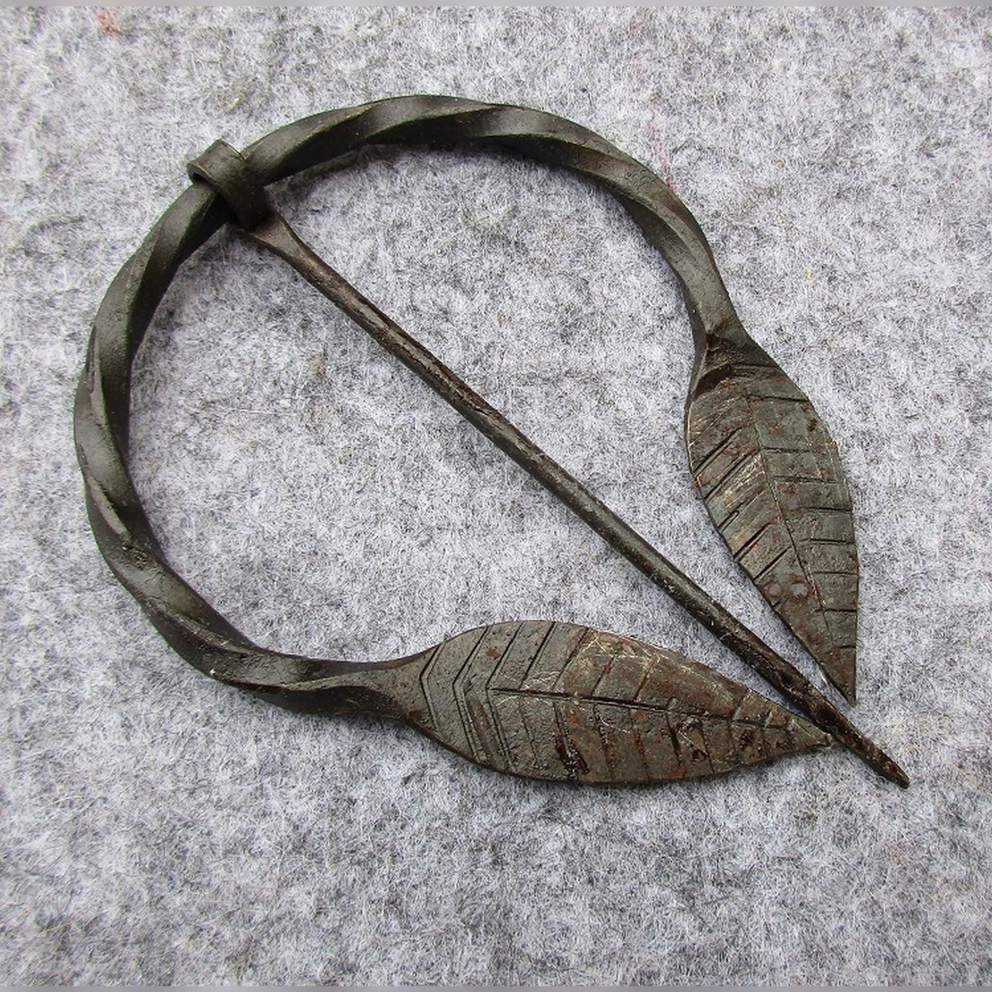 Geschmiedete Fibel in Eisen mit Blattenden. Kann rosten. Masse mit Blätter: 80mm.