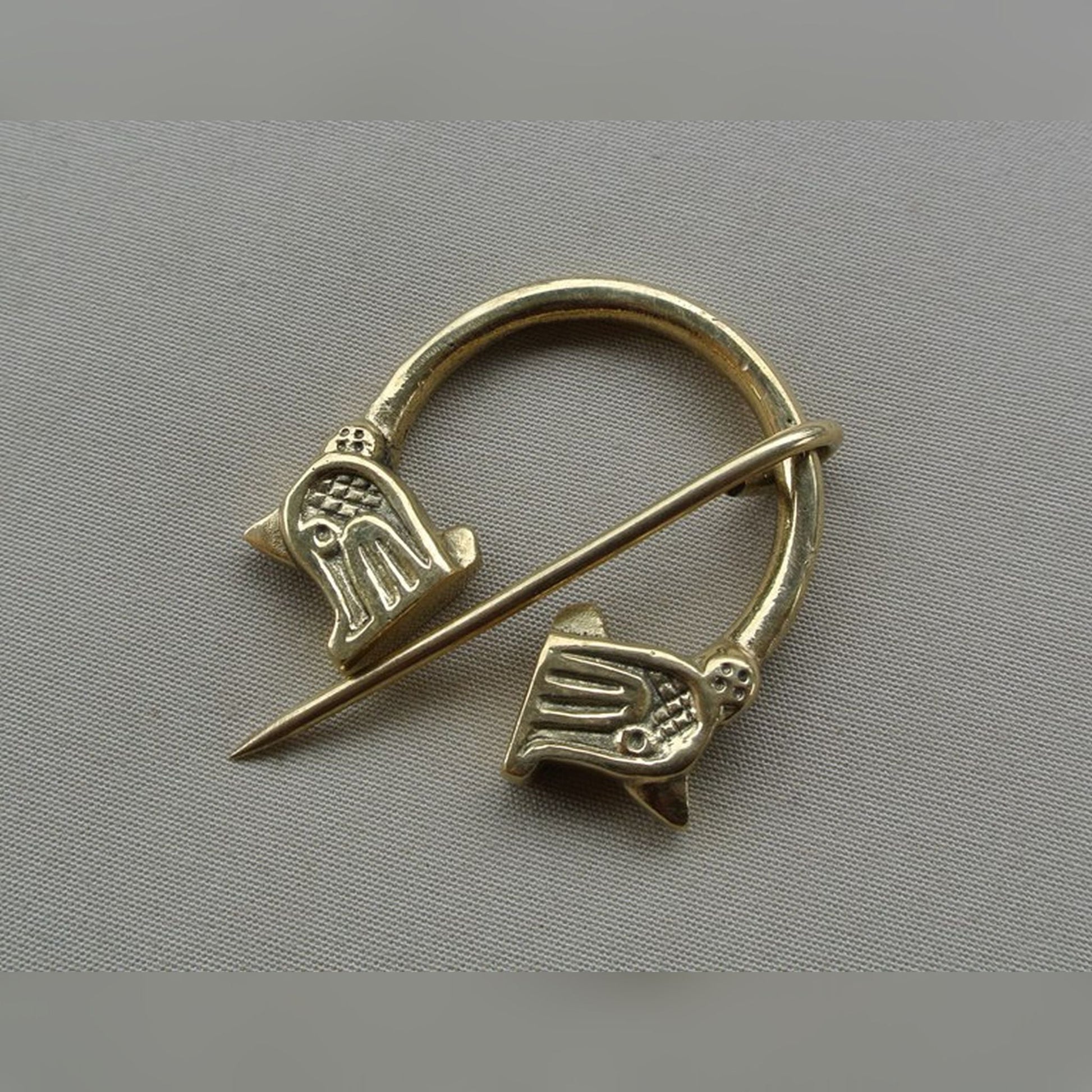 Schwere Fibel in Bronze. Von Kopf zu Kopf 65mm breit.
