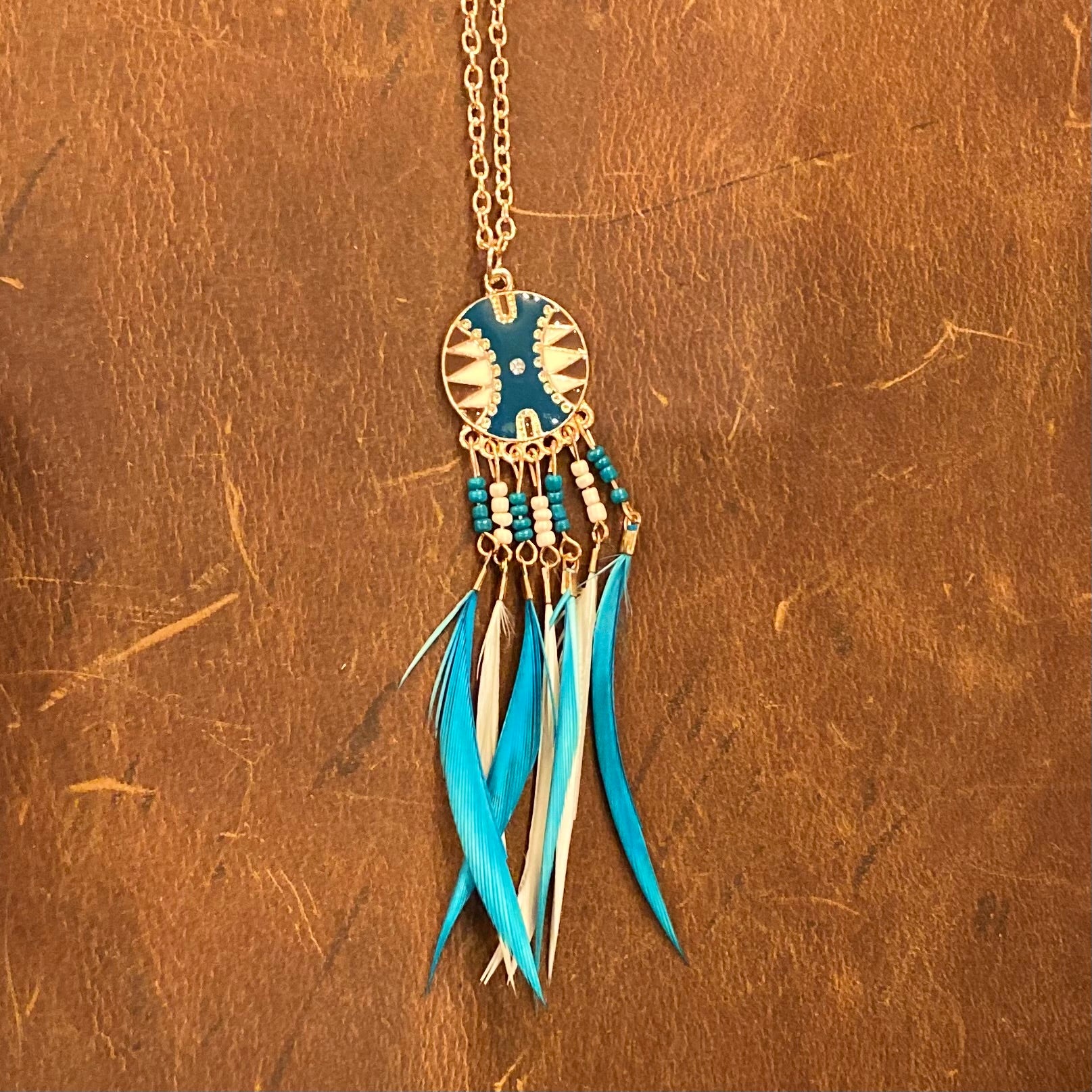 Toller Hingucker für den Indianer. In türkis, weiss mit gold und Federn. Die dazugehörende Kette hat eine Länge von 70cm.