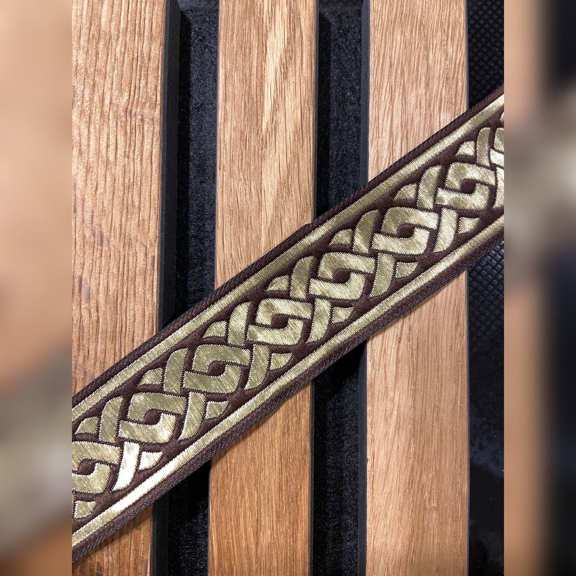 Eindrückliches Keltenmuster in gold auf dunkelbraun. Breite 35mm Preis pro Meter.