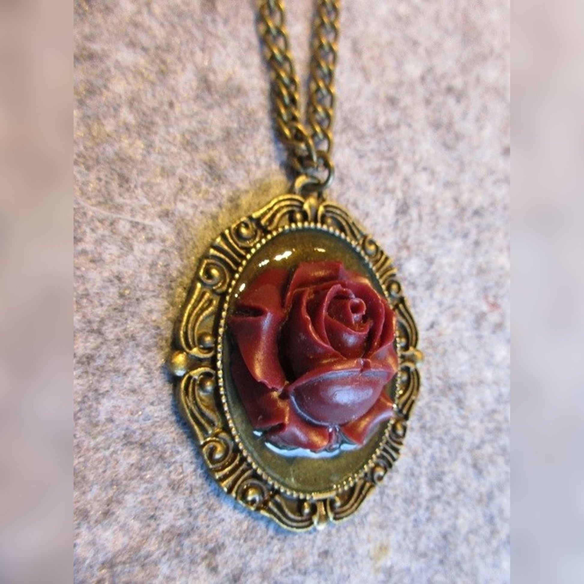 Tolle Kette in messing mit Rosenmedaillon in rot und grün. Das Medaillon ist aus Kunststoff.