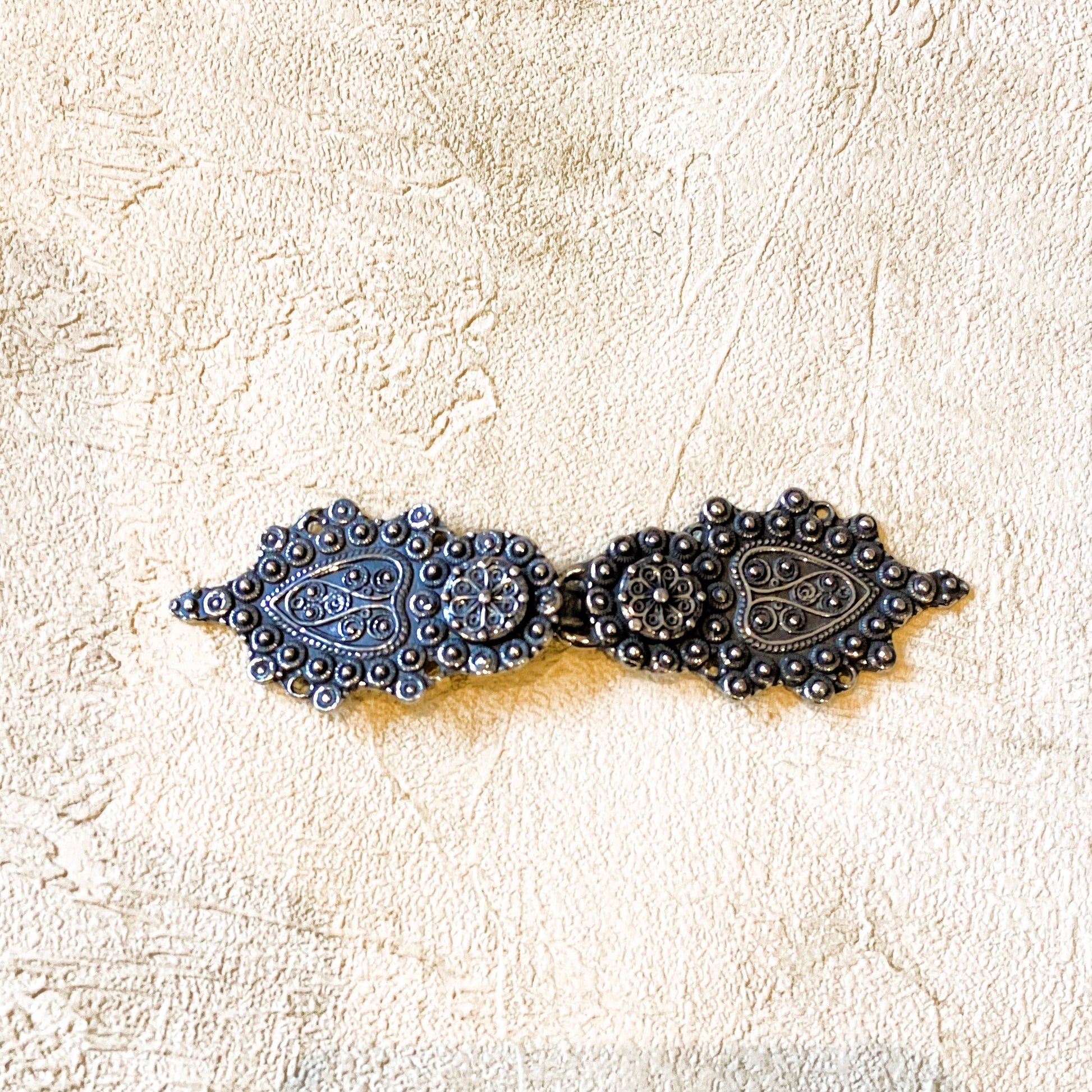 Ein spezieller Verschluss aus unserer Reihe von den "Samen" Verschlüssen. Dieser Verschluss stammt aus dem hohen Norden und wird beim Samenvolk für deren Trachten benutzt. Er wird aus Zinn gemacht. Masse: 105x30mm.
