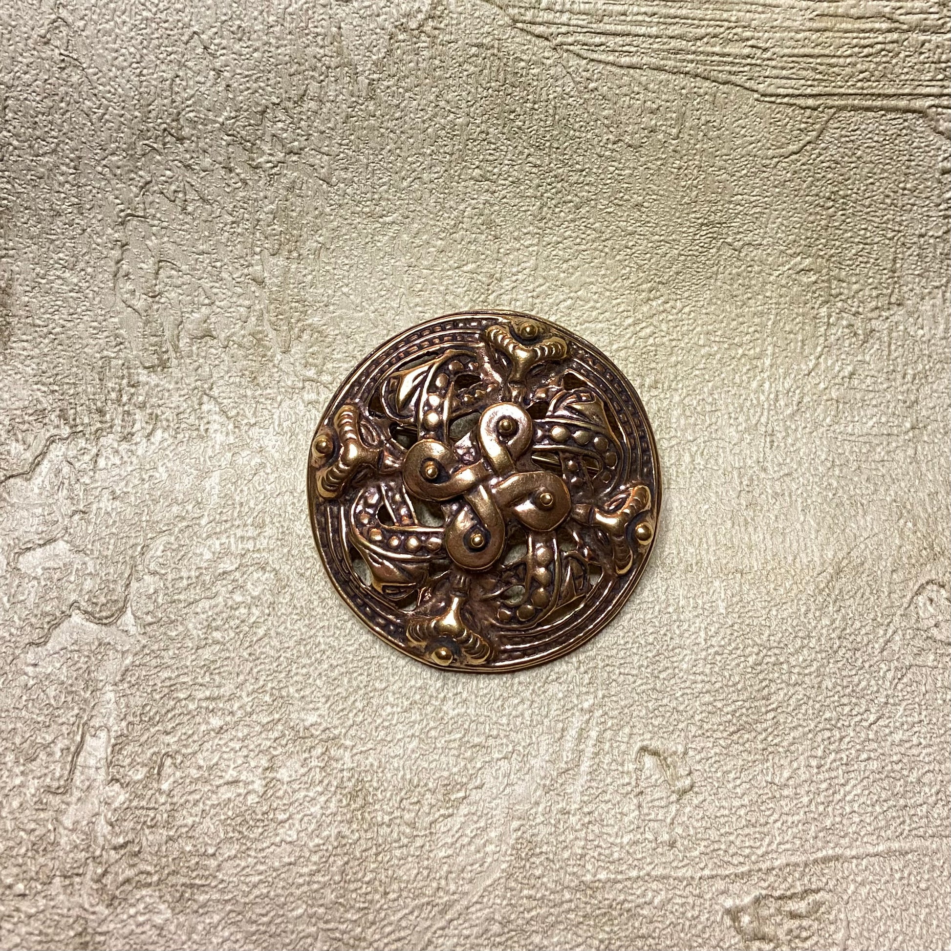 Brosche gross mit den vier Elementen in Bronze. Durchmesser 5,9 cm.